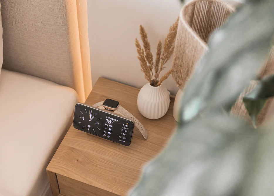 That isn’t necessarily a problem, but it can reduce the sense of order in a space where you want to relax. A charger that supports multiple devices brings those functions together in one design. Your phone and Apple Watch share a single dedicated place, without separate chargers. Your nightstand stays organised while your devices charge as usual.