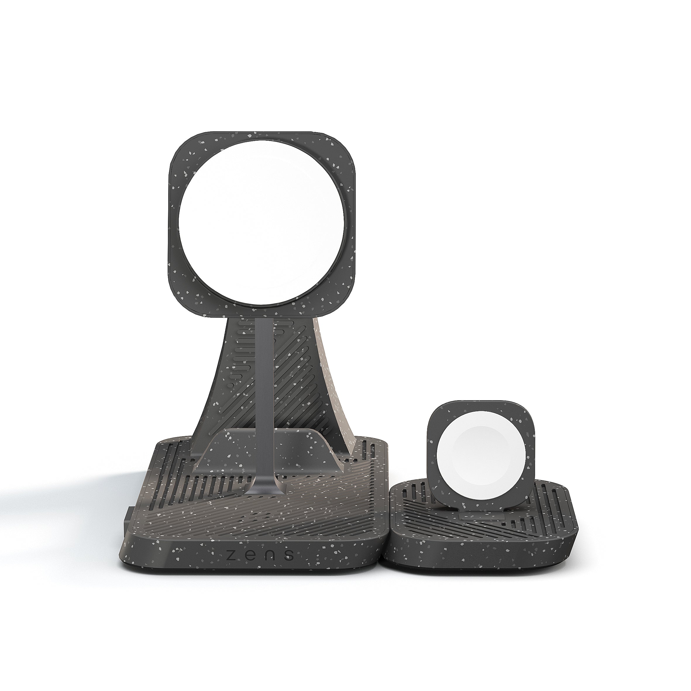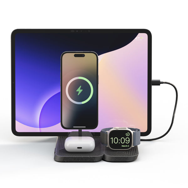 The 4-in-1 Modular Wireless Charger with iPad Charging Stand is a sustainable all-in-one solution made from recycled plastic. It delivers fast wireless charging up to 15W and supports Apple Standby mode. The main station charges your iPhone, AirPods and iPad, while the Apple Watch extension magnetically connects for added versatility. A 65W power adapter is included, and the built-in USB-C port delivers up to 30W to power your iPad or other USB-C devices.